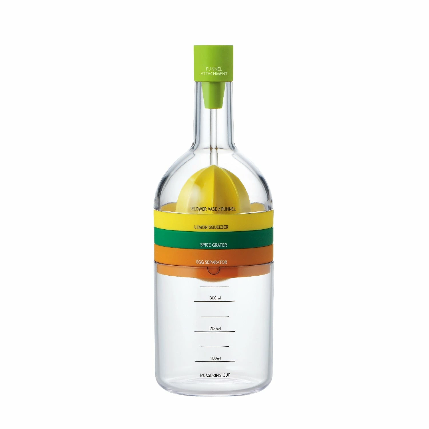 - Components: Funnel, lemon squeezer, grater, egg crusher, cheese grater, cap opener, yolk remover, measuring cup (420 mL).
